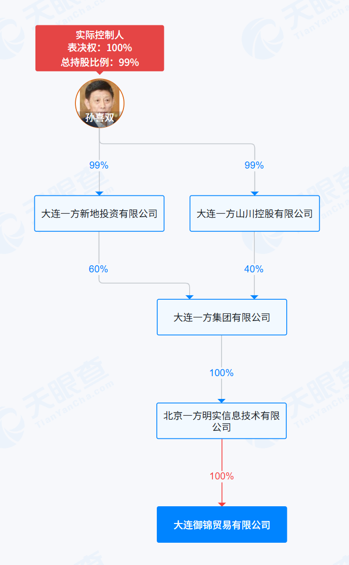 天眼查显示,大连御锦贸易有限公司成立于2023年11月30日,注册资本50万元,其唯一股东为北京一方明实信息技术有限公司,而后者由一方集团100%持股。一方集团的实际控制人孙喜双,是王健林多年的核心好友与重要合作伙伴,两人在地产、文旅等多个领域有着长期深度合作。